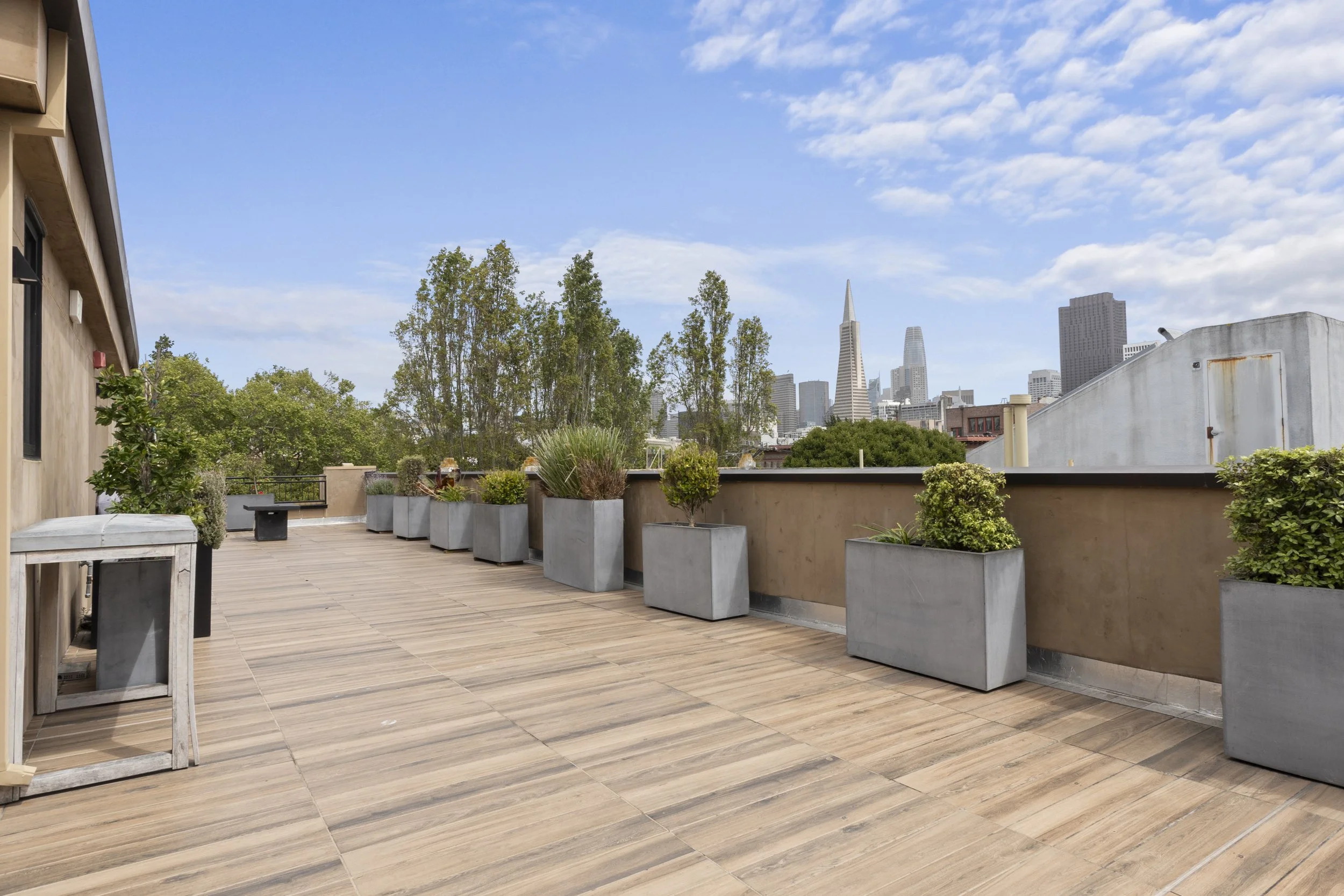 Rooftop terrace with modern outdoor furniture, planters, and city skyline view.
