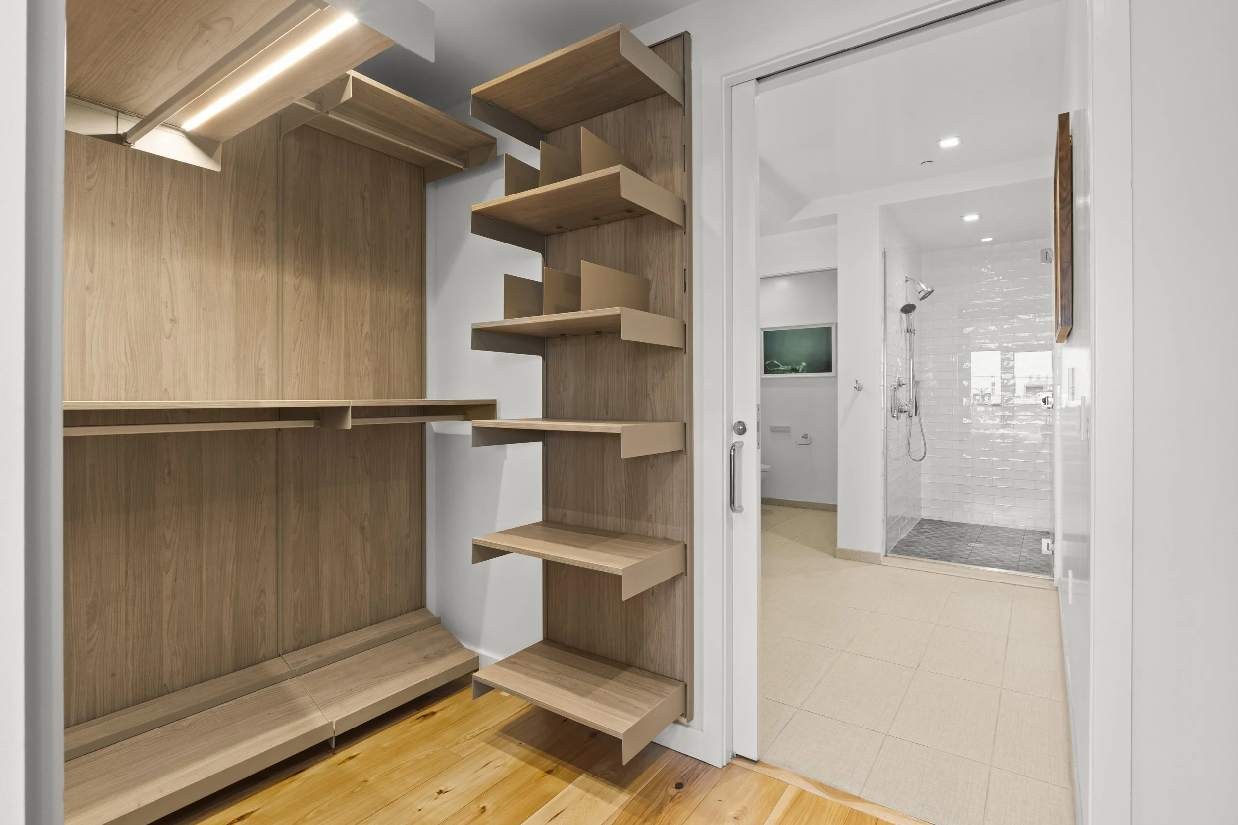 Modern wooden closet with shelves and garment rods next to a bathroom with a tiled shower and glass door. View fullsize