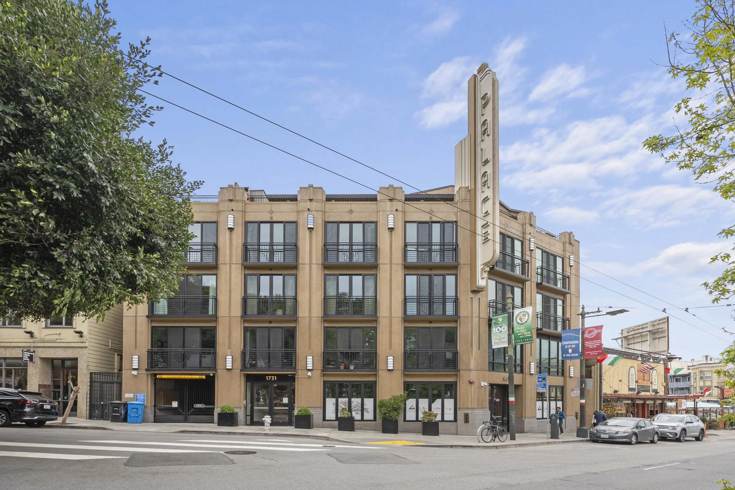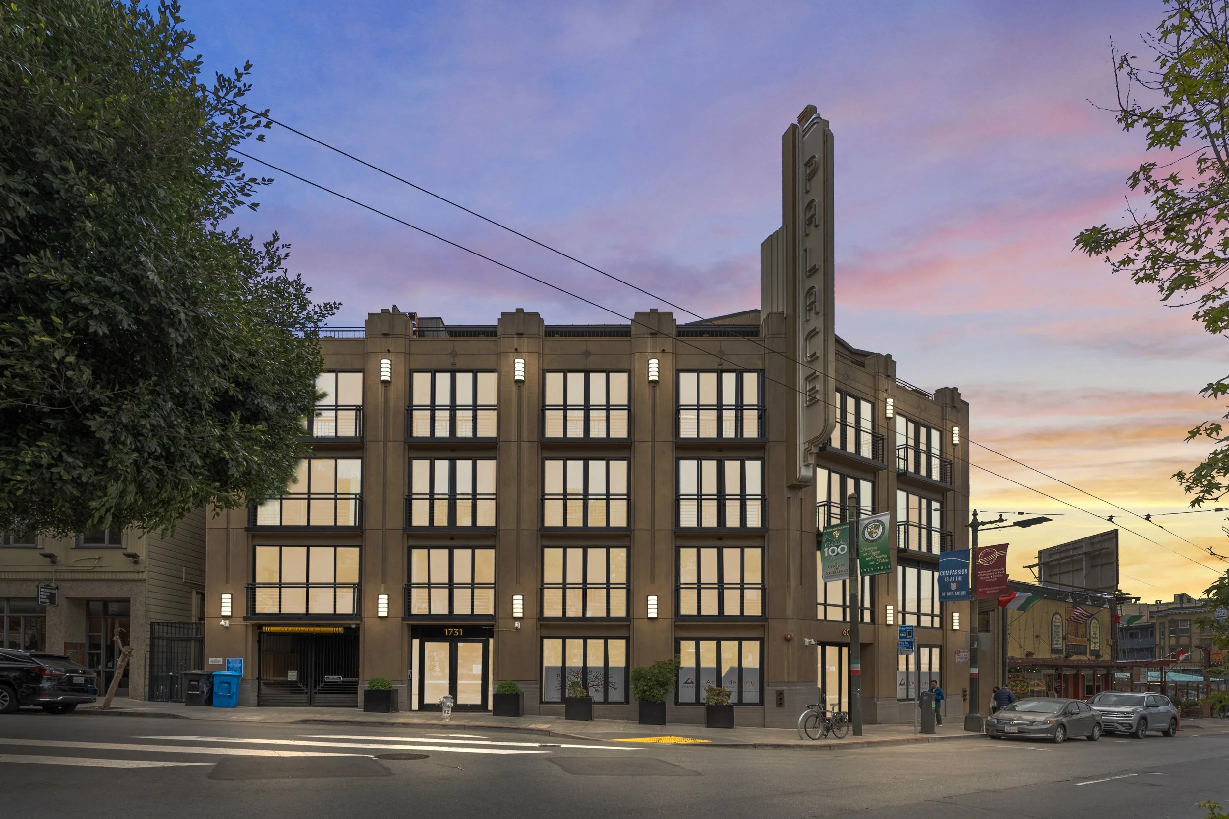 Four-story building with large windows, street signs, and a vertical sign reading 'PALACE' on the corner. Trees and parked cars are visible on the street.