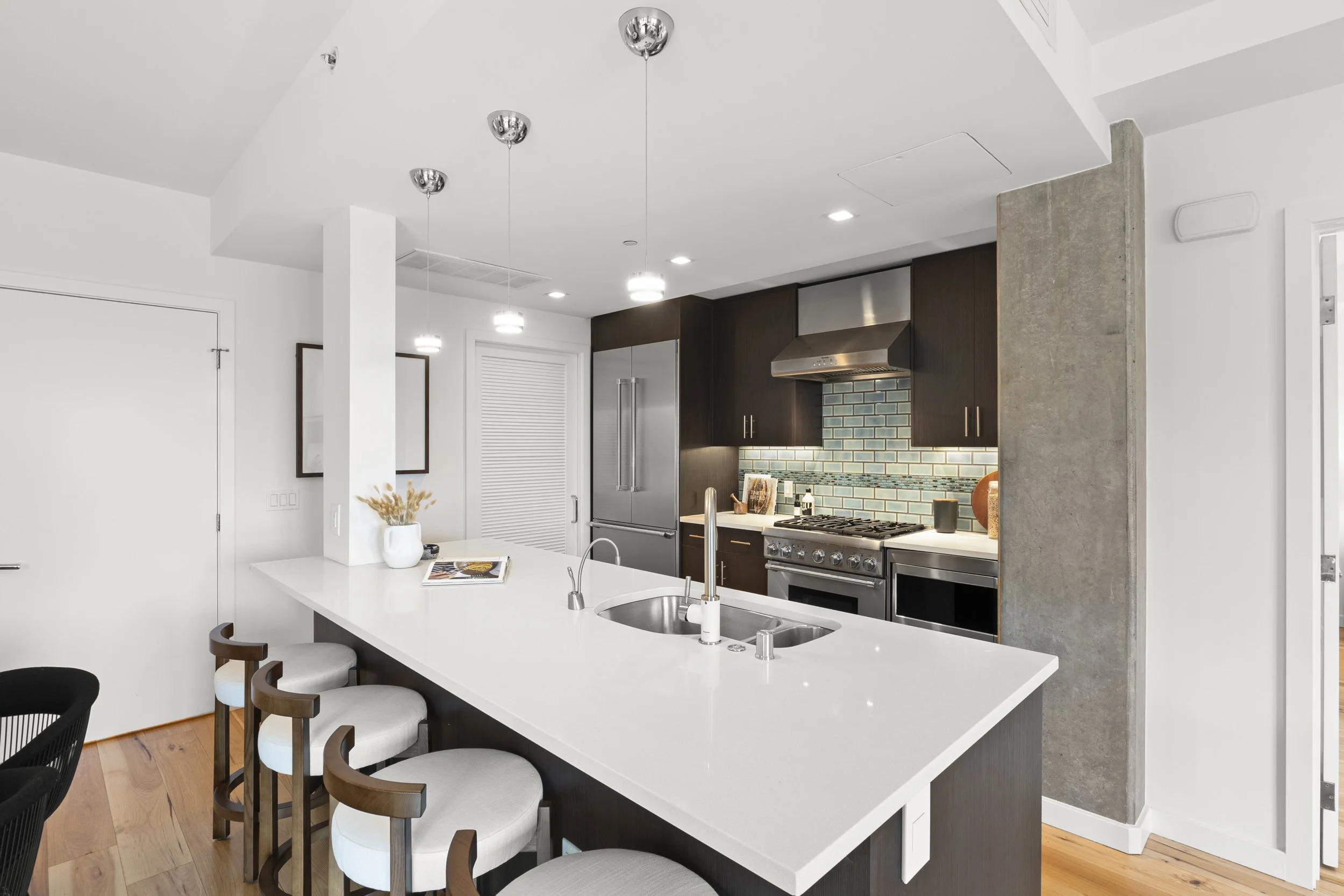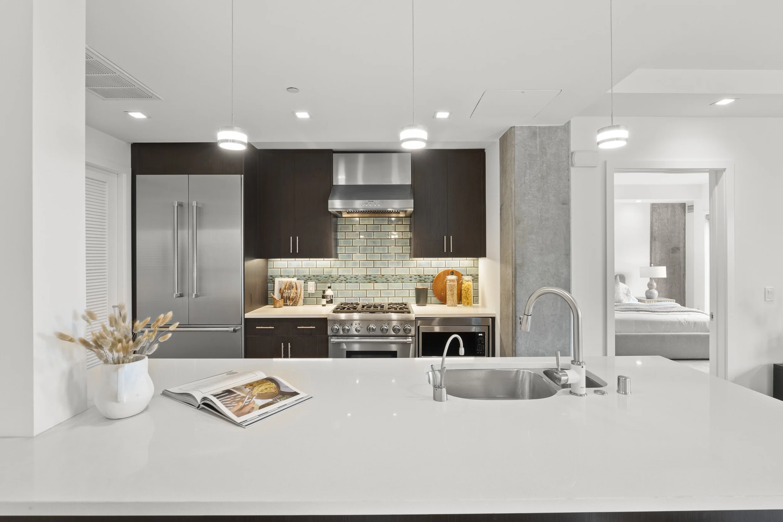 Modern kitchen with white countertops, stainless steel appliances, and pendant lights