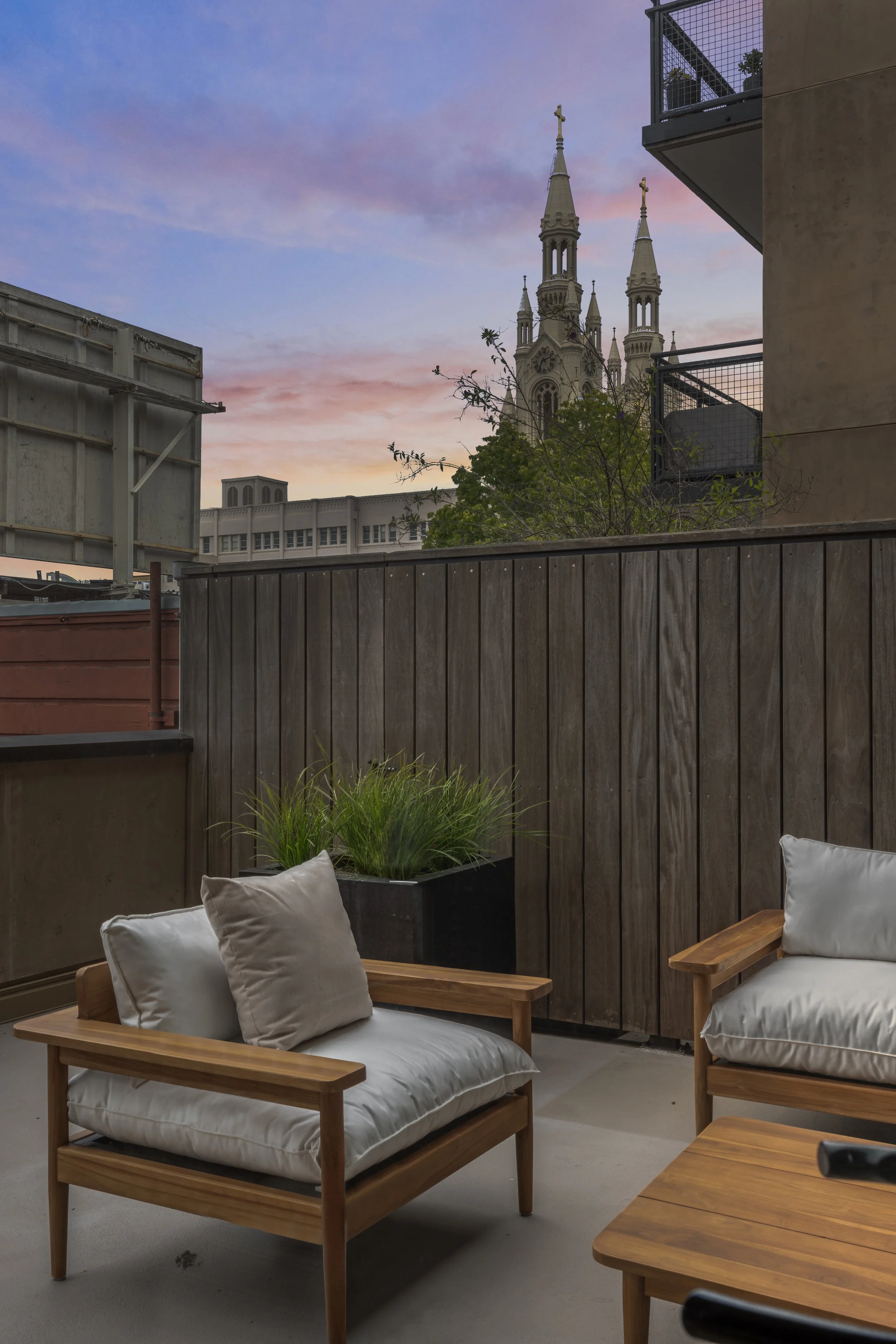 Rooftop terrace with a modern fire pit and potted plants, overlooking a church with two spires and a tower set against a clear blue sky. View fullsize