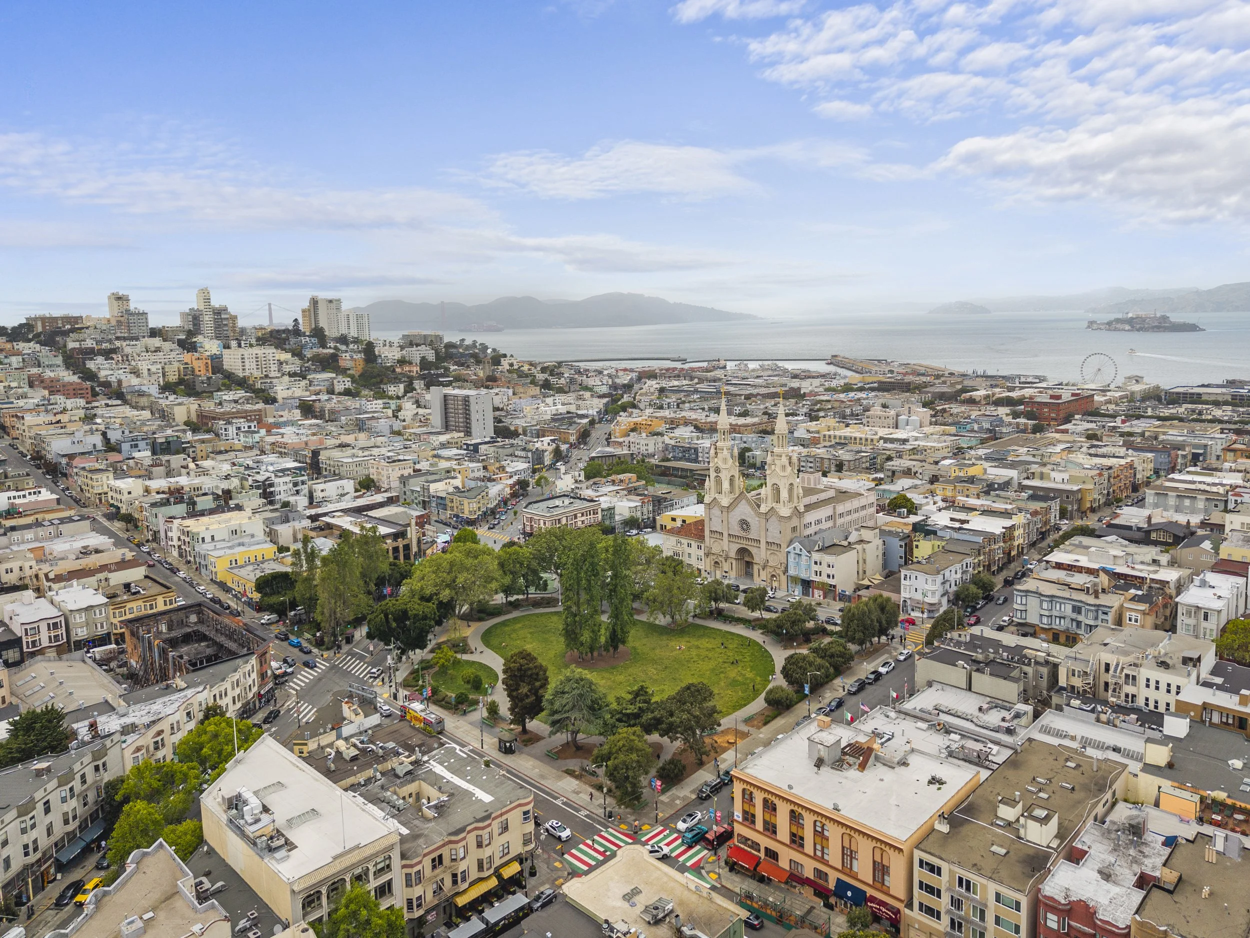 Aerial view of San Francisco's North Beach neighborhood with Washington Square Park in the foreground, a church, and city buildings surrounding the area. The Golden Gate Bridge is visible in the distance with the bay and Alcatraz Island. View fullsize