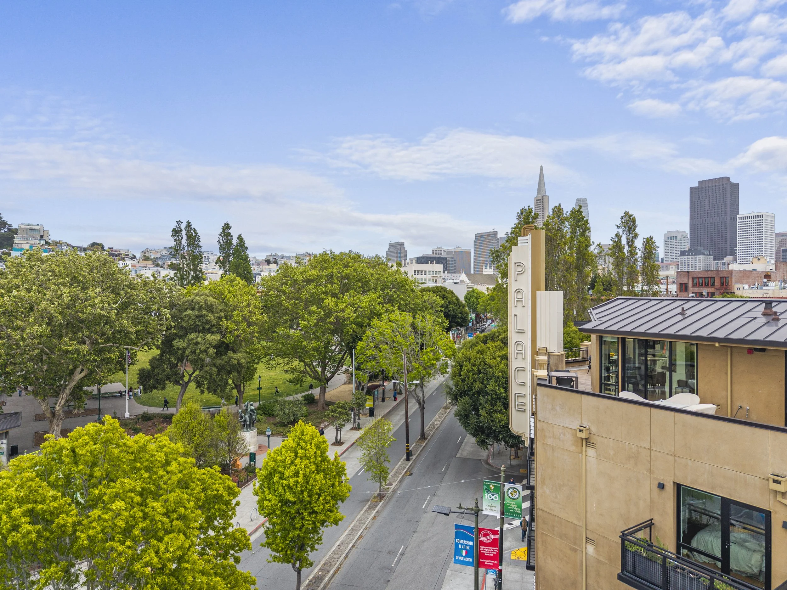 Aerial view of San Francisco cityscape with Coit Tower and Transamerica Pyramid in the background, historic buildings, and greenery along Columbus Avenue. View fullsize