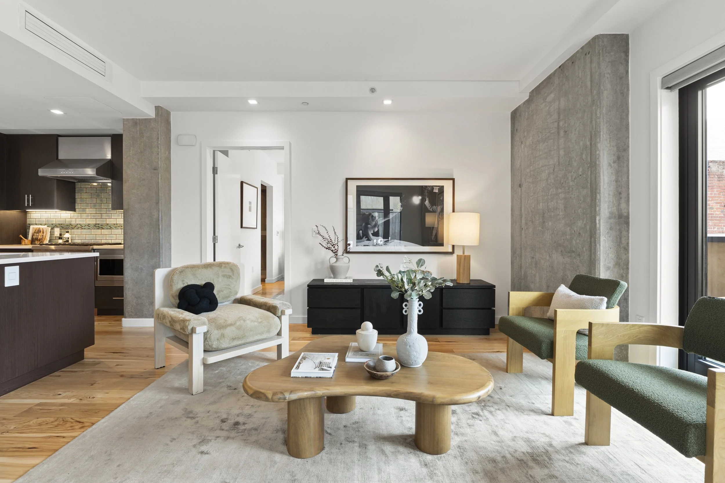 Modern living room with a mix of furniture, including a beige armchair, green chairs, and a wooden coffee table. The background features a kitchen area, art on the wall, and decorative vases on a dark cabinet. Natural light enters through large windo View fullsize