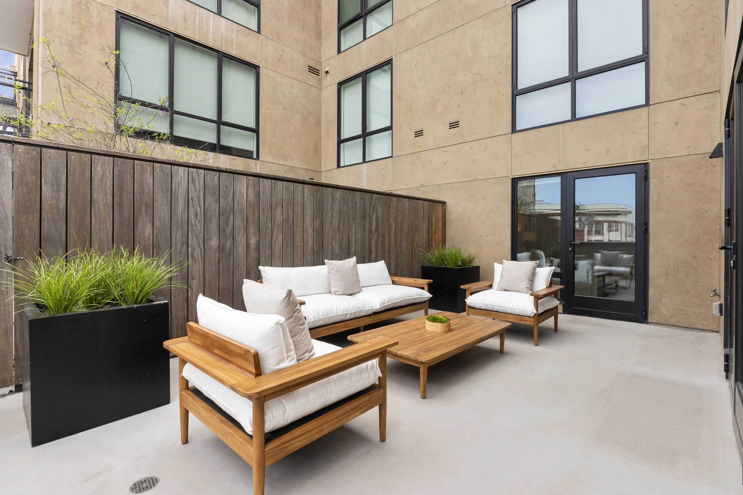 Modern outdoor patio with wooden furniture, including a sofa and chairs with white cushions, centered around a low wooden table, surrounded by planters with ornamental grasses, against a wooden privacy fence and building with large windows. View fullsize
