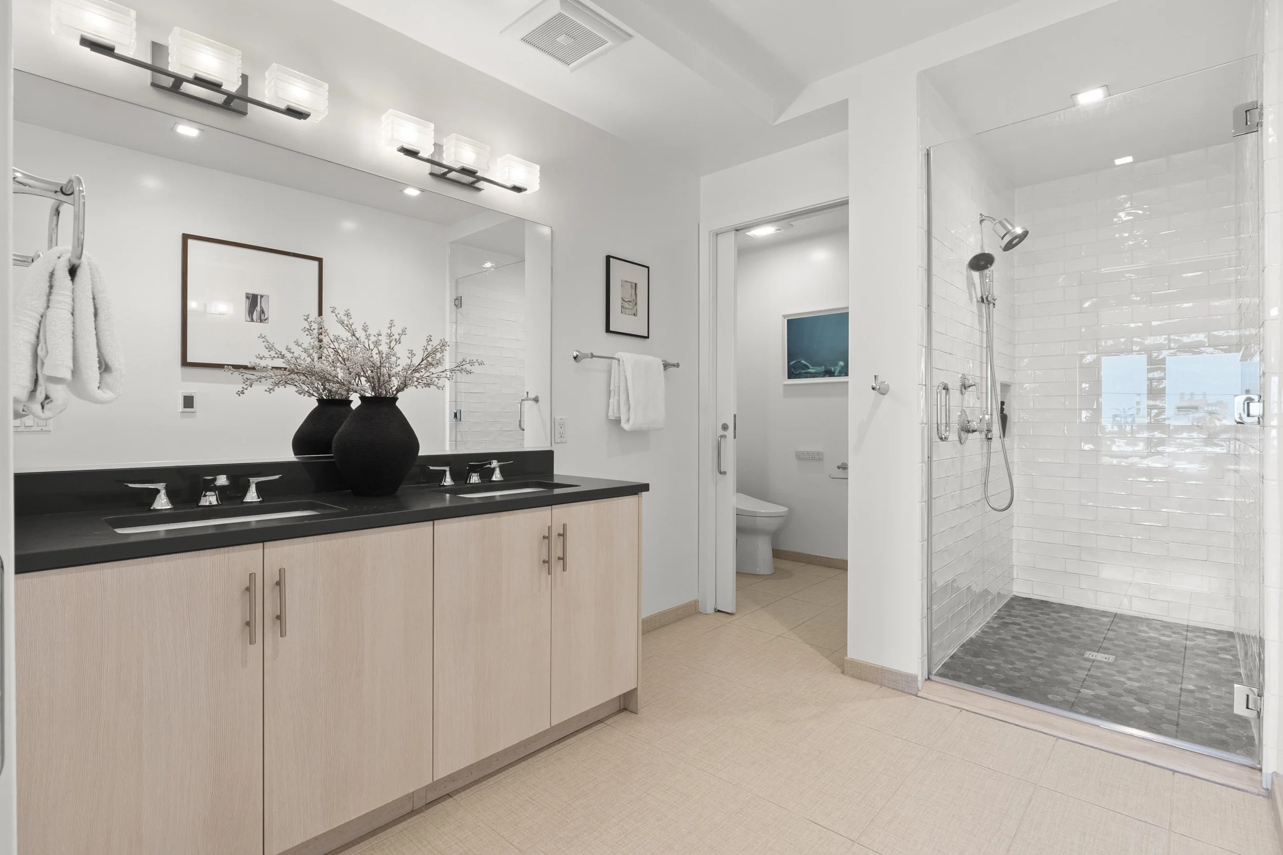 Modern bathroom with double sinks, black countertop, beige cabinets, large mirror, decorative vases, towel rack, glass-enclosed shower, and separate toilet room with white tile and neutral flooring.