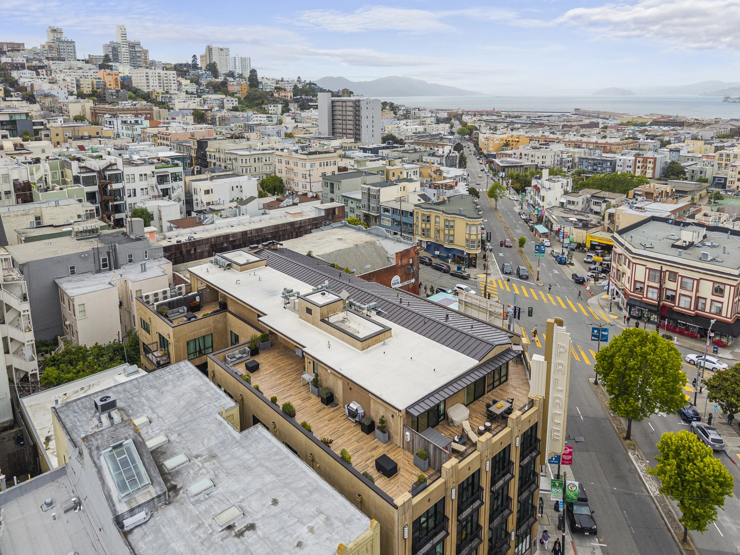 Aerial view of San Francisco cityscape with Coit Tower and Transamerica Pyramid in the background, historic buildings, and greenery along Columbus Avenue.