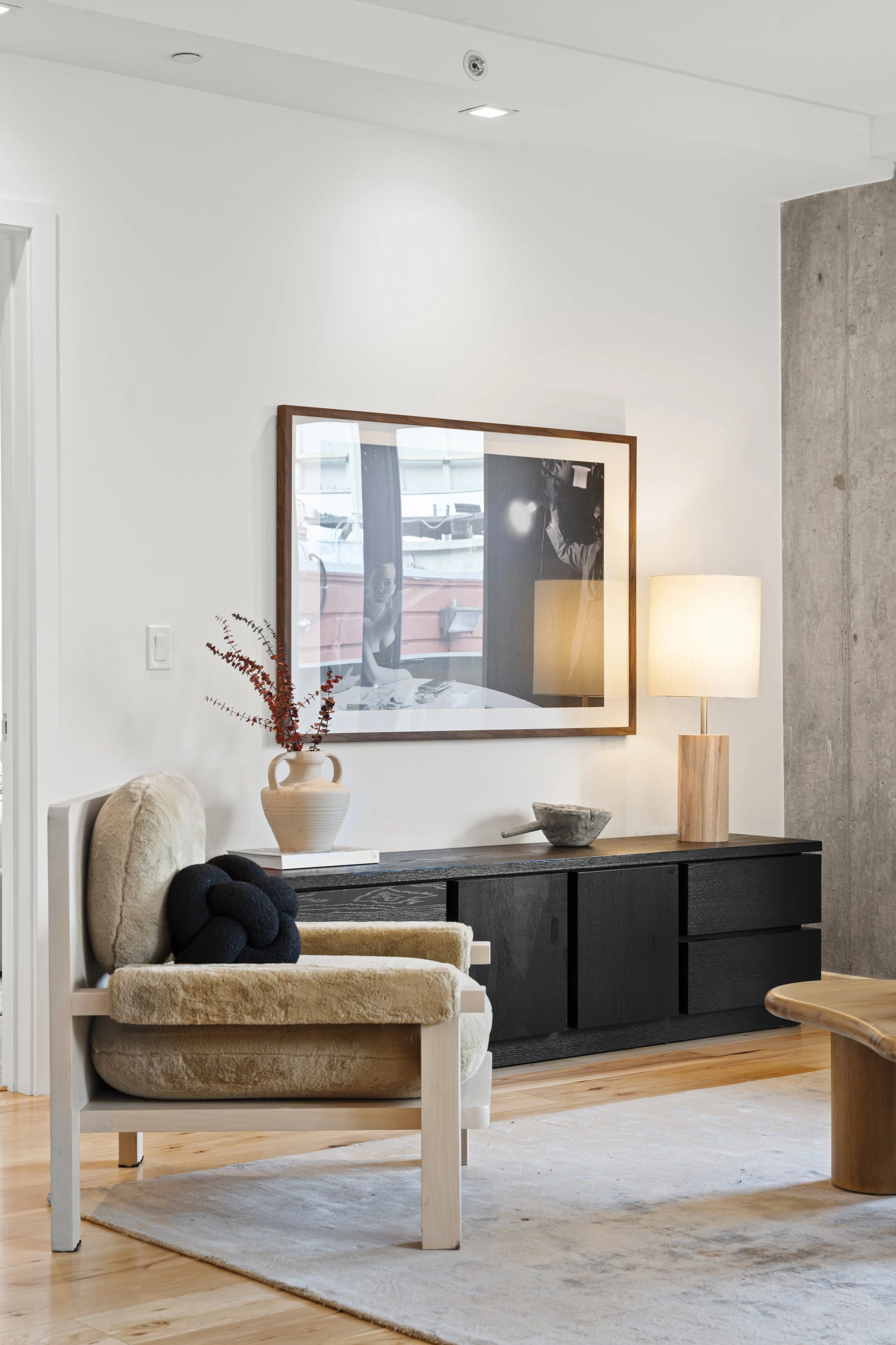 Modern living room interior with a plush beige chair, black sideboard, wooden lamp, decorative vase with red branches, abstract wall art, and light-colored rug on a wood floor.