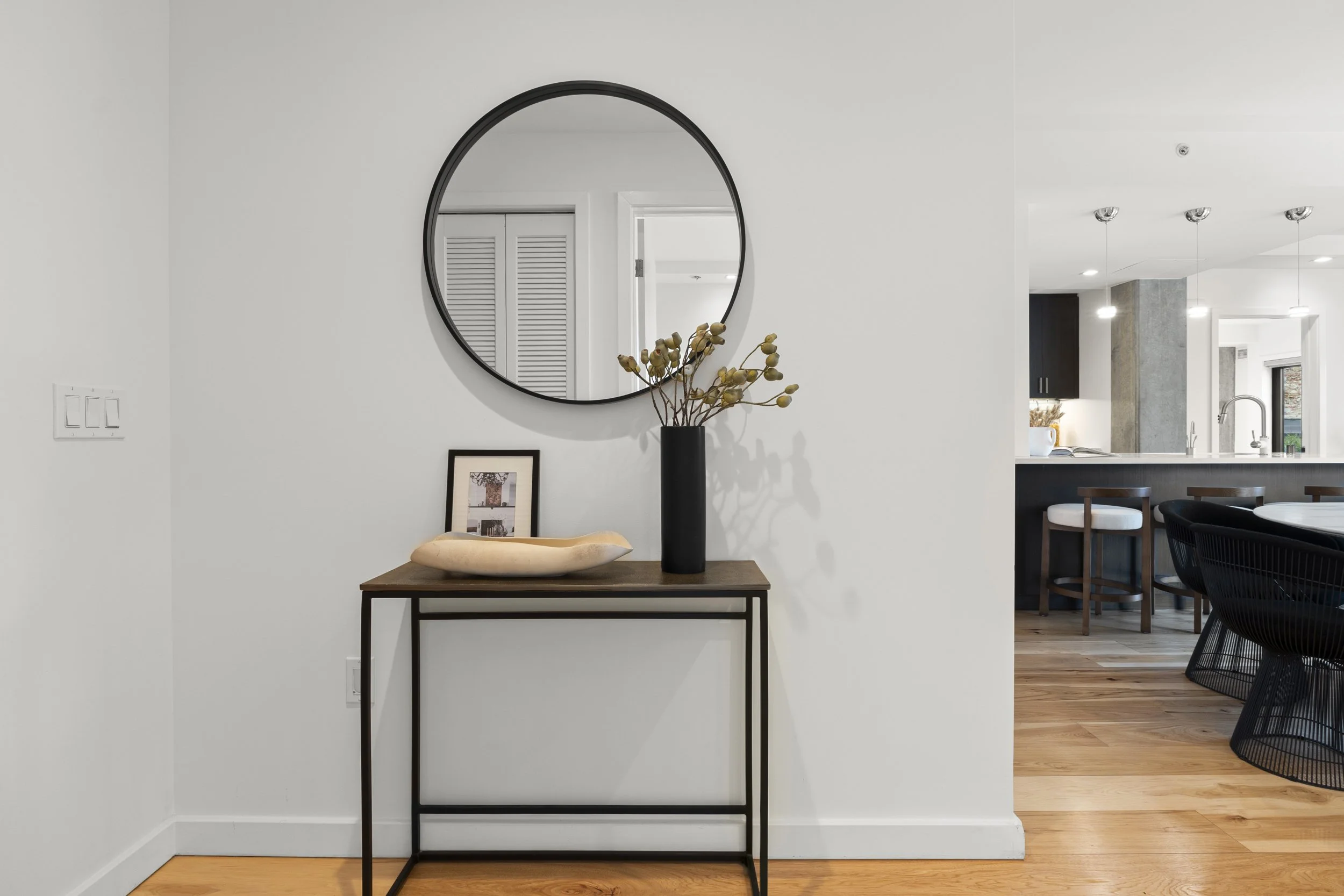 Modern entryway with round mirror, console table, decorative bowl, framed photo, and vase with branches.