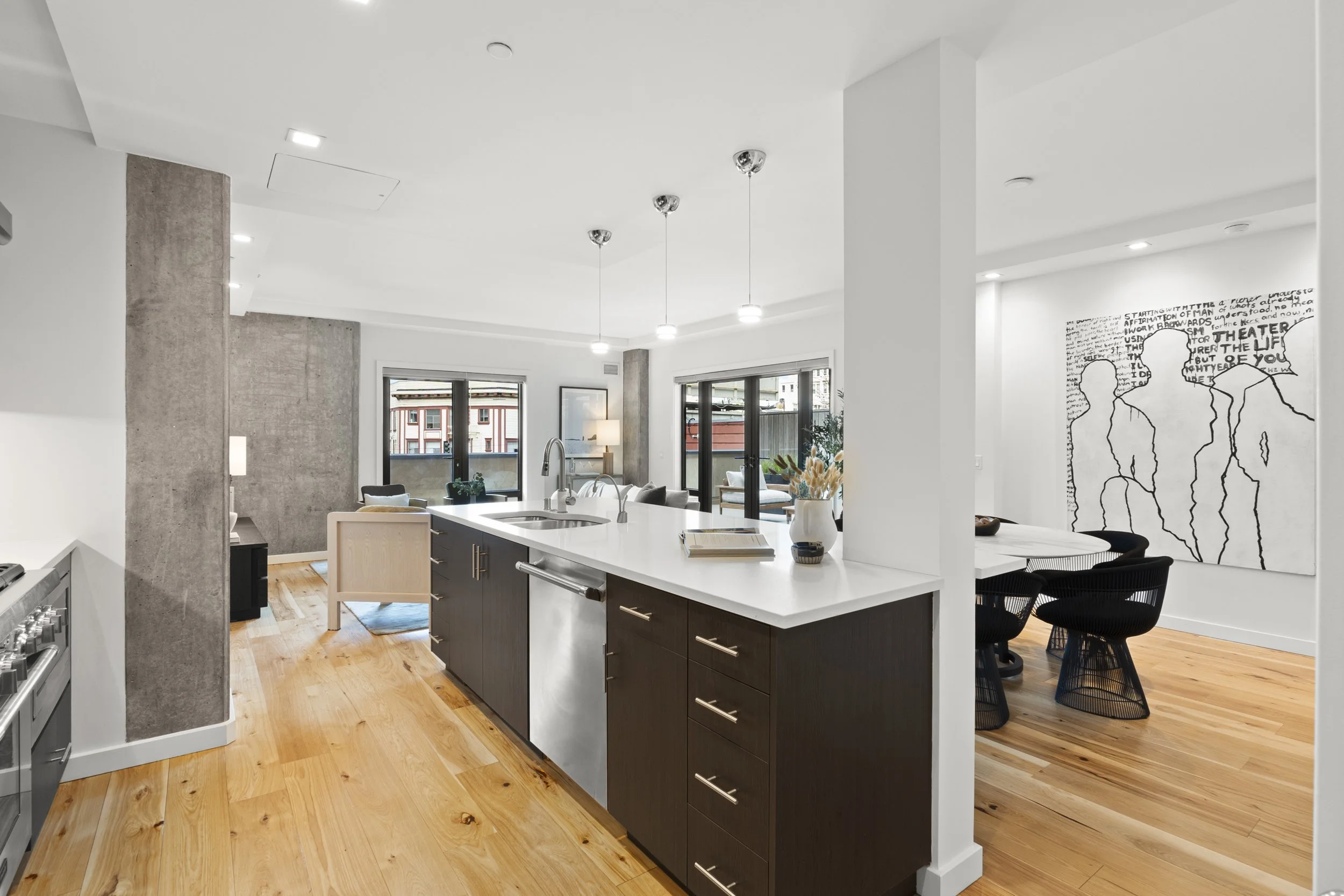 Modern open-plan living room and kitchen with wood flooring, dining table with black chairs, white countertops, and dark wood cabinets. Large windows and a potted plant enhance the space.