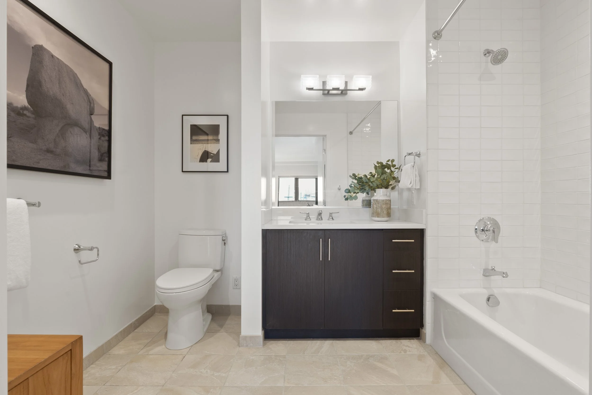 Modern bathroom with a white toilet, dark wood vanity, sink with chrome faucet, large mirror, bathtub with shower, framed art, and decorative plant.